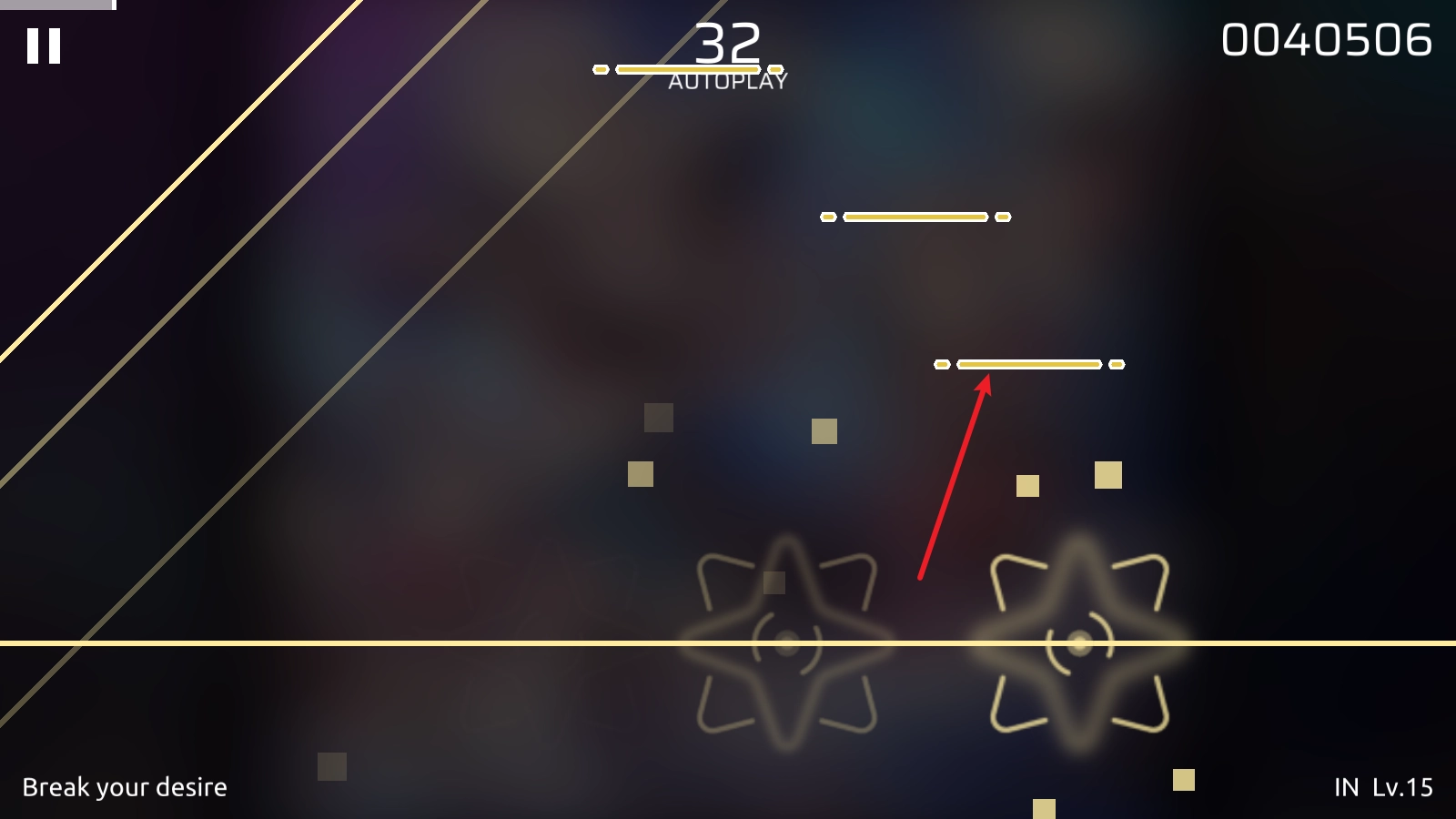 7、最后是紅色的音符,當(dāng)它抵達(dá)判定線時,朝任意方向滑動就行。