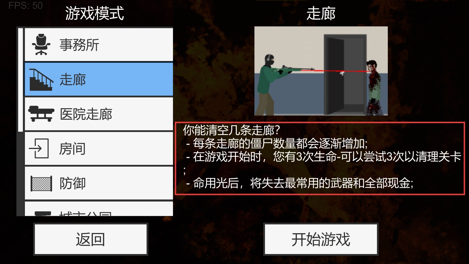 2、選擇【走廊】模式時(shí)要留意僵尸數(shù)量會(huì)逐漸增加,初始擁有3次生命,一旦失敗就會(huì)失去常用武器和現(xiàn)金。
