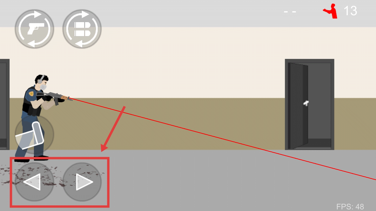 3、借助左側(cè)的【左右移動(dòng)】按鈕來(lái)調(diào)整角色所處位置,同時(shí)搭配武器切換鍵,提前對(duì)準(zhǔn)即將出現(xiàn)的僵尸進(jìn)行瞄準(zhǔn)。