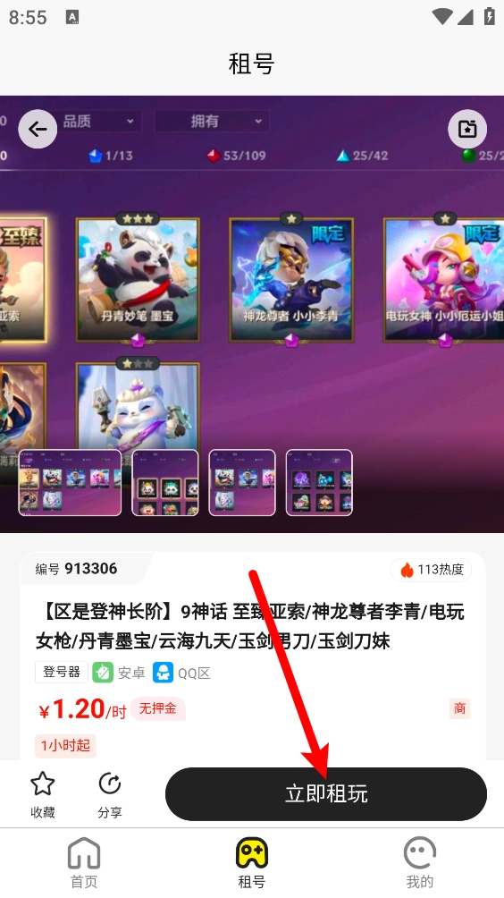 4、挑選好想要的商品后點擊進入,在詳情頁面能夠查看賬號相關信息,接著點擊“立即租玩”按鈕。