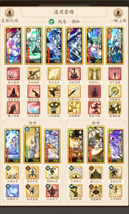 外功可選用氣海刀法、赤焰刀法、天刀大法、炎檀劍法、涅槃劍法與屠龍刀法;內(nèi)功推薦圣火神功或如意破心經(jīng);輕功則搭配魅影神行。此流派的傷害極為強(qiáng)勁,兼具持續(xù)輸出與爆發(fā)能力。若卡牌數(shù)量不夠,魔家刀法、無極刀法、滅世屠刀可用來替換部分武學(xué)。