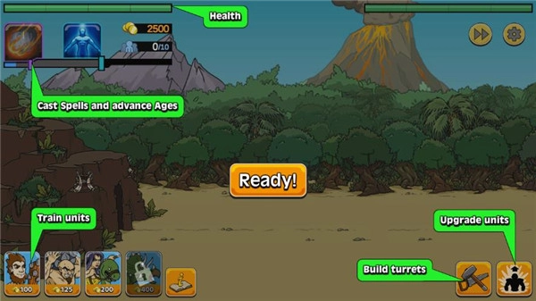 游戲玩家同樣得從石器時代起步,通過召喚恐龍、原始人之類的角色展開戰(zhàn)斗,同時逐步發(fā)展自身文明,依次跨越古埃及、中古世紀(jì)、現(xiàn)代直至未來。