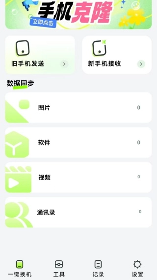 2、進入一鍵換機板塊,大家可以輕松實現舊手機發(fā)送、新手機接收,數據同步操作簡單。