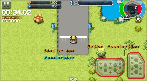 3、如圖所示,通過左右操作來控制方向,右下角的兩個按鈕分別對應(yīng)加速和剎車功能。