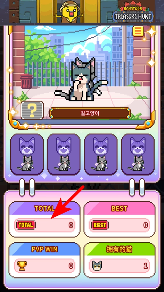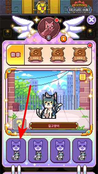 在貓咪養(yǎng)成界面,按照紅色箭頭的提示,點擊下方的貓咪卡片,解鎖相應的貓咪角色來增強游戲能力。
