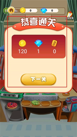 在通關(guān)結(jié)算界面點擊下一關(guān)按鈕,即可進入后續(xù)關(guān)卡的游戲流程,繼續(xù)完成烹飪相關(guān)的操作任務(wù)。