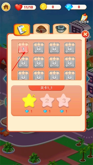 點擊“開始游戲”按鈕進入游戲,在關(guān)卡選擇界面找到已解鎖的第1關(guān)卡,點擊該關(guān)卡即可進入對應(yīng)的1-1關(guān)卡準備界面。