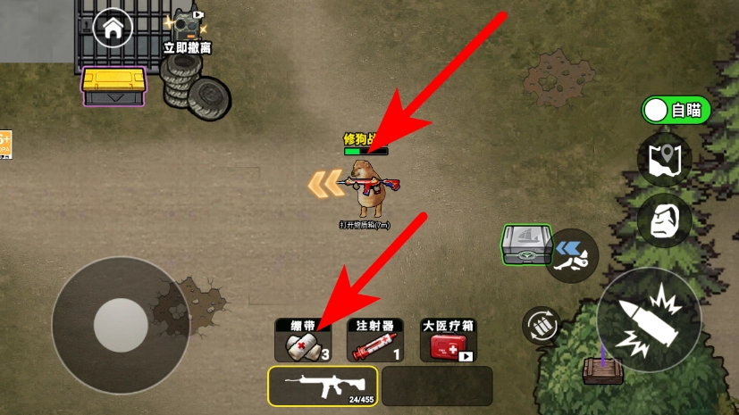 在游戲界面,查看血條,點擊底部繃帶加血量。