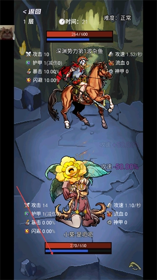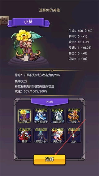 選擇英雄小葵吧,她的技能能夠奪取敵人的攻擊力,同時(shí)還能提高自身的攻擊速度,點(diǎn)擊選擇就能進(jìn)入戰(zhàn)斗啦。