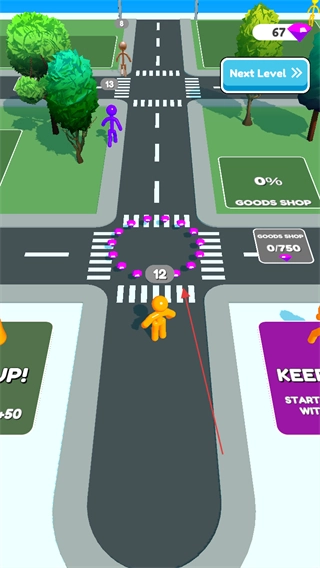 進(jìn)入游戲后,屏幕上方顯示的數(shù)字67大概率代表分?jǐn)?shù),你需要操控角色在道路上持續(xù)前進(jìn),同時(shí)注意觀察路上那些帶有數(shù)字標(biāo)識的圓環(huán)。