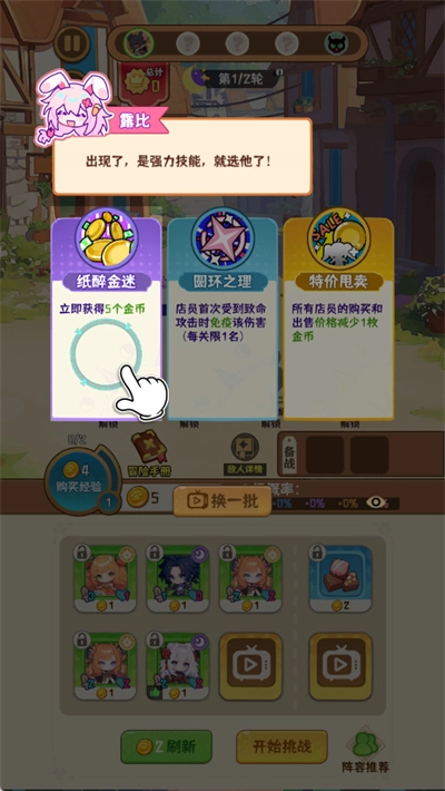 3、6-10關(guān)攢錢,碰到+1、+2攻擊永久技能,保證10利息前提下喂麋謎。若第5關(guān)未升4星,每關(guān)評估是否能打過,適時選+50%金幣啟動。10關(guān)若遇強敵,選+50%金幣技能快速啟動。
