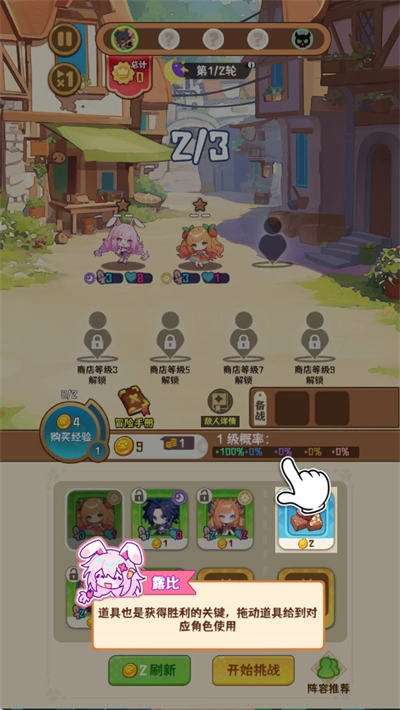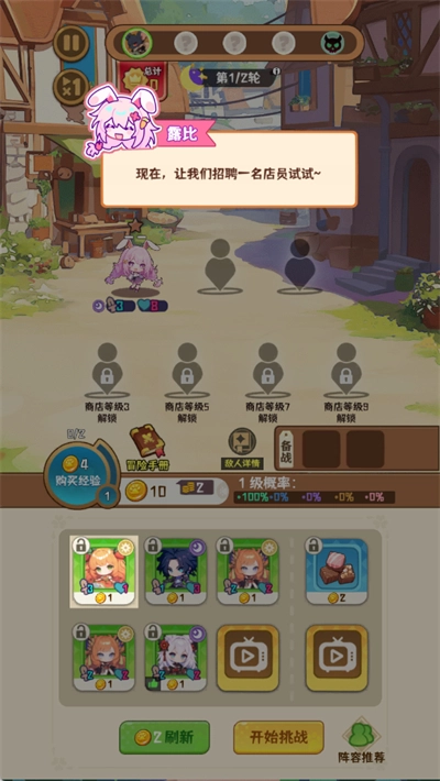 2、1-5關(guān)準備50以上蘋果和100以上刷新票,開局找1麋謎、2布蘭妮。技能選店員-1金幣,加5利息上限,買經(jīng)驗額外+2。優(yōu)先買綠卡,升二星后賣賺金幣。保持場上1鬧鬧,其他易二星卡留下。到第5關(guān)評估BOSS傷害,若需提升,選永久+10攻擊技能。