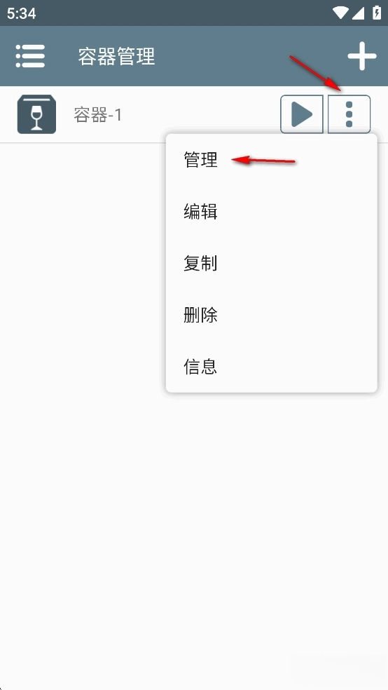 創(chuàng)建容器后點(diǎn)擊右邊三個(gè)點(diǎn),點(diǎn)擊【管理】