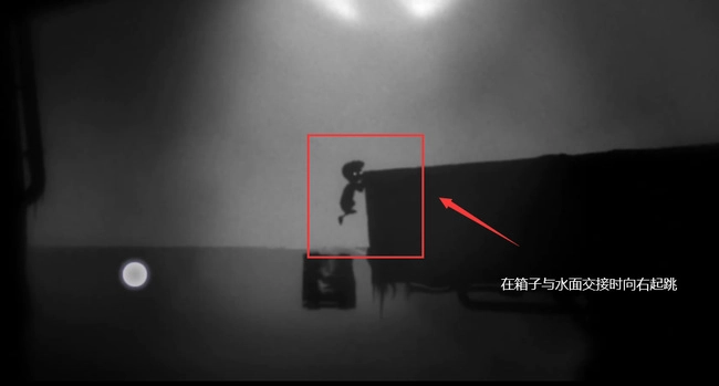 八、爬上平臺后,你的右側(cè)會出現(xiàn)一個新箱子。請盡快將箱子向左拖至下圖所示位置,等待箱子上浮。(注意:此箱子與之前的不同,它比較重,會隨水位上升和時間流逝而下沉,務(wù)必把握好時機,切勿浪費過多時間,否則會溺死。)