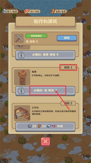 在【制作與建筑】界面,將【塔樓】升級到2級的前提是滿足【必備條件:鎬-等級2】,解鎖后能夠拓展視野并開啟新的領(lǐng)土。