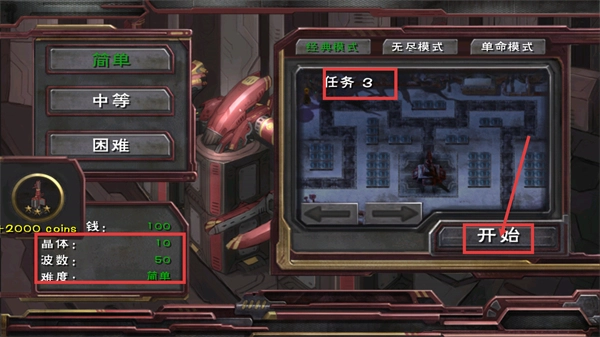 選擇【任務(wù)3】后點(diǎn)擊【開始】按鈕,首先確認(rèn)難度為【簡單】,開局會擁有【2000-coins】的錢幣、【10】個晶體等資源,要提前做好戰(zhàn)前準(zhǔn)備。