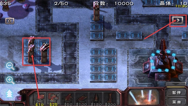 消耗【10】-錢來部署防御塔,注意右上角顯示的【晶體-10】,通過搭建塔防來積累【10000】-分?jǐn)?shù),并且要留意資源數(shù)值的變動情況。
