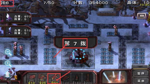 應(yīng)對【第7波】敵人,查看敵方【血量-970】等屬性,消耗【850】資金強(qiáng)化塔防,持續(xù)積累【354000】分?jǐn)?shù)推進(jìn)關(guān)卡。