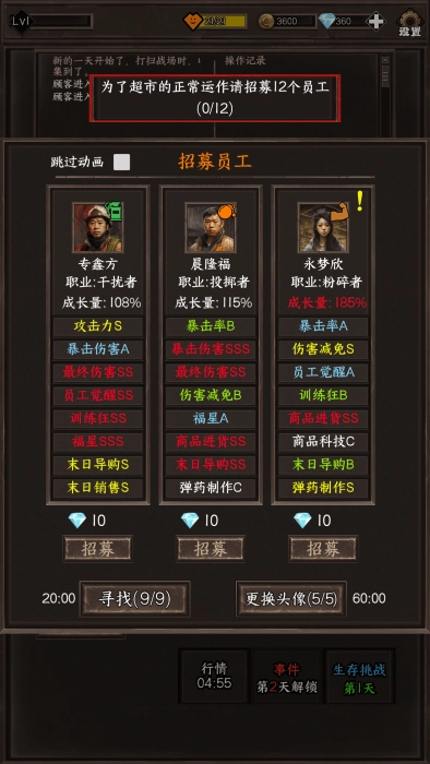 首先得招到12名員工,這里有不少屬性超厲害的,能自主挑選招募。
