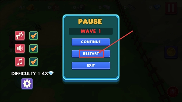 在【PAUSE】界面選擇【RESTART】選項(xiàng),就能重新開(kāi)啟當(dāng)前的【W(wǎng)AVE-1】關(guān)卡,方便玩家調(diào)整策略再次嘗試。