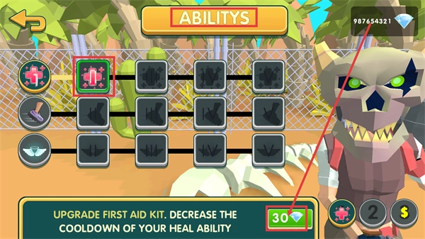 在【ABILITIES】界面中,花費(fèi)【30】鉆石對(duì)【FIRST-AID-KIT】進(jìn)行升級(jí),能夠減少治療技能的冷卻時(shí)長(zhǎng)。