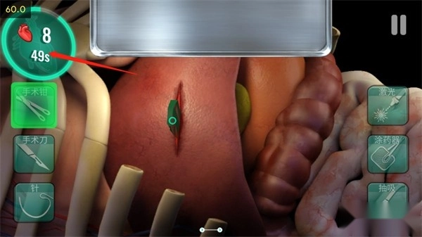 6、手術(shù)是有時間限制的,在左上角的顯示的時間內(nèi)完成得分會更高。如果時間到了還沒完成則手術(shù)失敗。