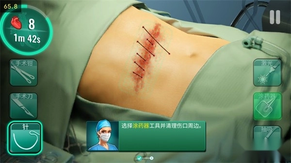 5、先點(diǎn)擊針將病人的傷口縫合起來,再點(diǎn)擊涂藥器清理傷口周邊區(qū)域,手術(shù)就完成啦。