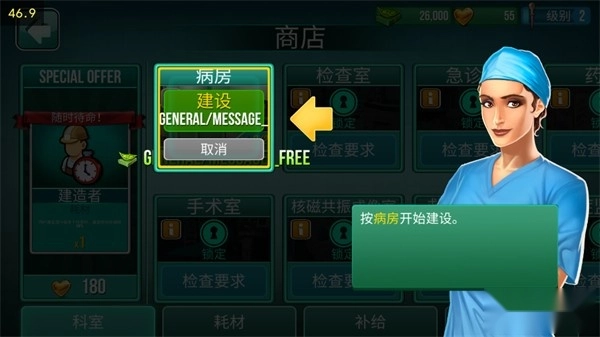 8、醫(yī)院建成后,還需建設(shè)病房供病人居住,點(diǎn)擊商店按鈕即可訪問病房及其他科室。