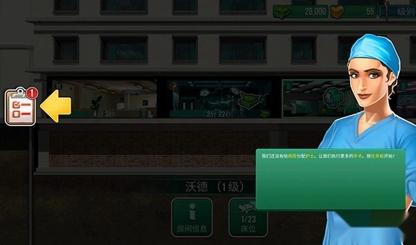 12、點(diǎn)擊左側(cè)的任務(wù)單,按按任務(wù)版開始手術(shù)任務(wù),賺取更多的金幣來招募員工。