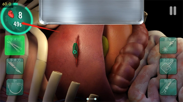 4、開始第一個手術(shù),心臟代表難度,數(shù)目越低難度越高,限時2分鐘。