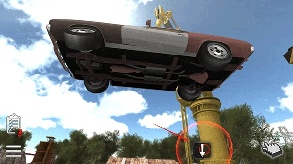 進入“修理我的車”游戲后,你需要按照游戲提示把汽車放到地面上進行修理,第一步是點擊下降按鍵。
