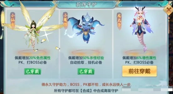 小仙女:佩戴后可提升20%的免傷效果,無論是切磋對戰(zhàn)還是挑戰(zhàn)BOSS都必不可少。