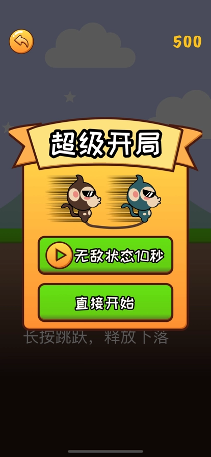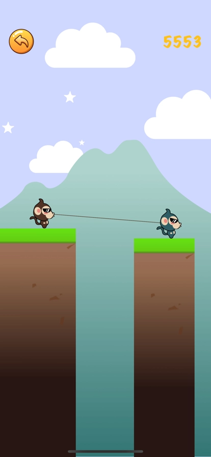 1、每點(diǎn)擊屏幕一次,在后面的一只小猴子就會(huì)往前跳躍一段的距離,按的時(shí)間越長(zhǎng),小猴子跳躍的距離越長(zhǎng),最長(zhǎng)距離為兩只小猴子之間的繩索長(zhǎng)度。