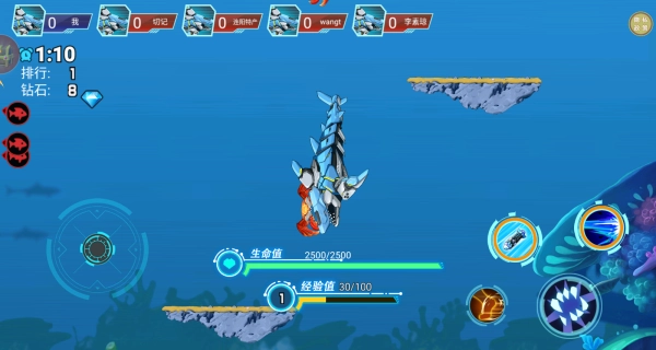 1、進(jìn)入游戲后,你將操控機(jī)械鯊魚在海底世界自由穿梭,當(dāng)發(fā)現(xiàn)獵物時,點(diǎn)擊攻擊按鈕即可展開捕食。