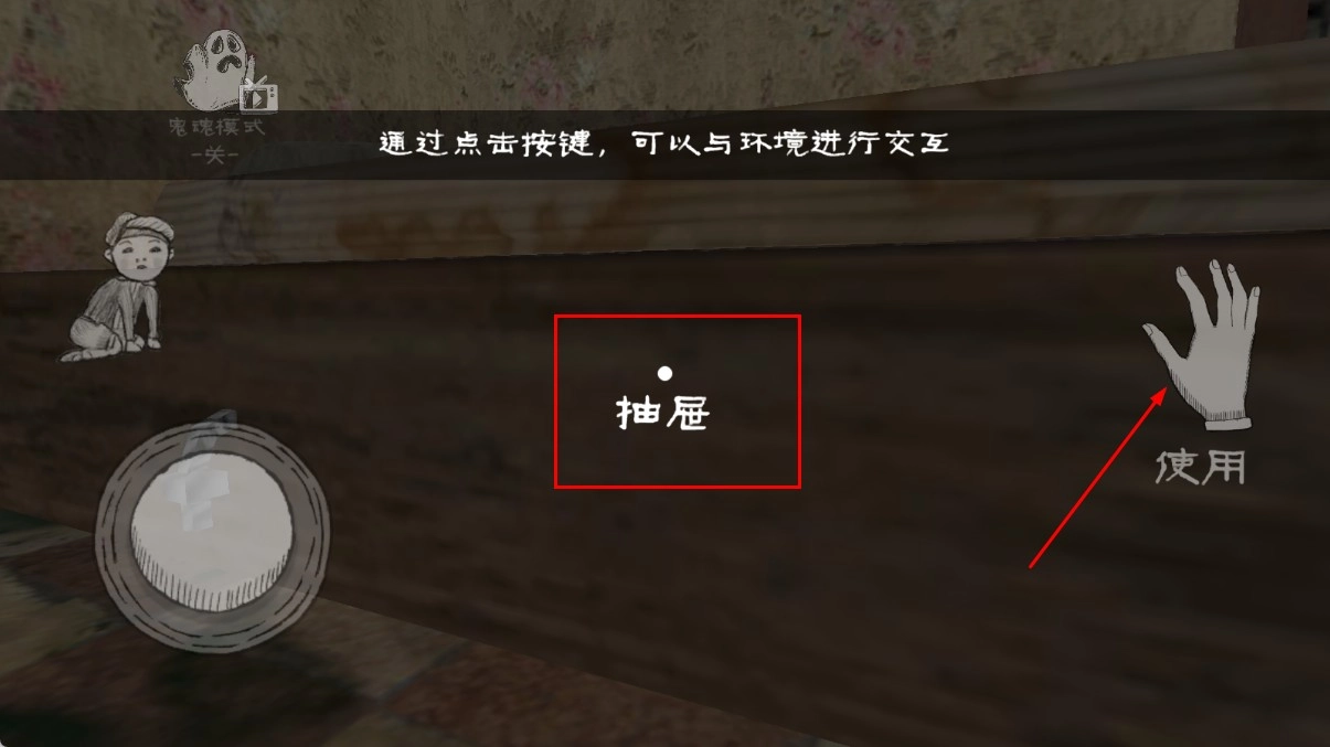 3、當(dāng)遇到抽屜這類可交互的物體時,點(diǎn)擊右側(cè)的使用按鈕,就能和抽屜產(chǎn)生互動,試著打開抽屜來獲取里面可能存在的道具或者線索。