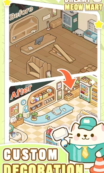 3、玩家能夠借助各式各樣可愛的裝飾物對超市進(jìn)行裝修,挑選不同的裝飾風(fēng)格,擺放家具以及貓咪玩具等物品。
