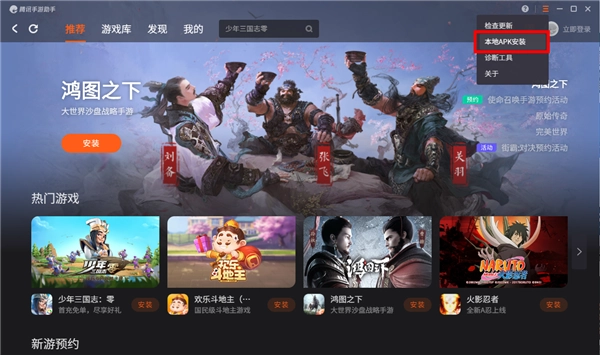 第三步:啟動騰訊助手,點(diǎn)擊右上角菜單欄中的本地apk選項(xiàng)