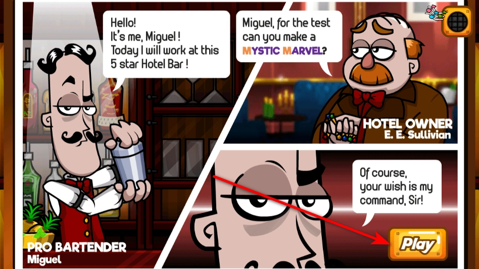 1、進(jìn)入后扮演調(diào)酒師,接到酒店老板調(diào)制特定飲品的任務(wù),確認(rèn)需求后點(diǎn)擊開始按鈕即可開啟調(diào)酒流程,準(zhǔn)備著手完成調(diào)酒任務(wù)。
