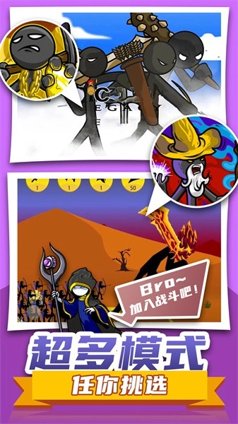 1、組建火柴人戰(zhàn)隊(duì):進(jìn)入游戲后,玩家需要組建屬于自己的火柴人戰(zhàn)隊(duì),挑選不同類(lèi)型的火柴人士兵,為接下來(lái)參與戰(zhàn)爭(zhēng)做好準(zhǔn)備。